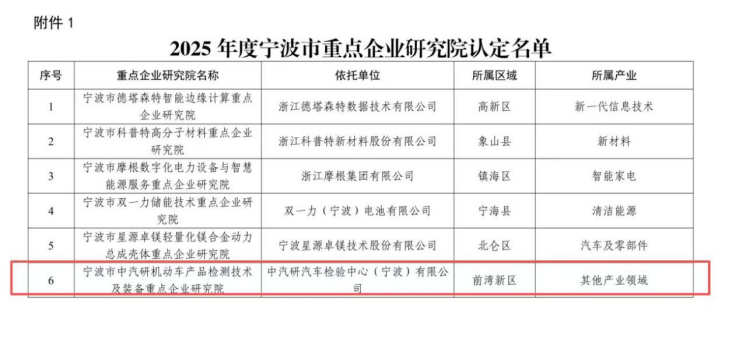 近日,寧波市2025年度擬認定市級重點企業研究院名單公示,中汽研汽車檢驗中心(寧波)有限公司(以下簡稱“公司”)憑借自身的技術實力成功躋身市級科創陣營,斬獲重點研究院殊榮——寧波市中汽研機動車產品檢測技術及裝備重點企業研究院,標志著公司在汽車檢測領域科研能力獲市級權威認可。