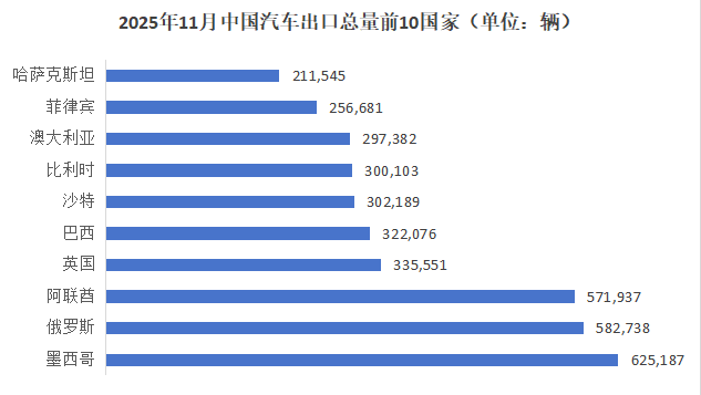 近年來,中國(guó)汽車出口規(guī)模與效益實(shí)現(xiàn)快速增長(zhǎng)。2025年1-12月,我國(guó)汽車出口總量達(dá)832萬(wàn)輛,同比增長(zhǎng)30%,其中新能源汽車出口343萬(wàn)輛,同比大幅增長(zhǎng)70%,增速顯著高于去年同期水平。整車出口市場(chǎng)呈現(xiàn)多元化格局,墨西哥、俄羅斯、阿聯(lián)酋、巴西、英國(guó)等位居前列,阿聯(lián)酋、墨西哥、澳大利亞、阿爾及利亞、英國(guó)等市場(chǎng)增量尤為顯著。