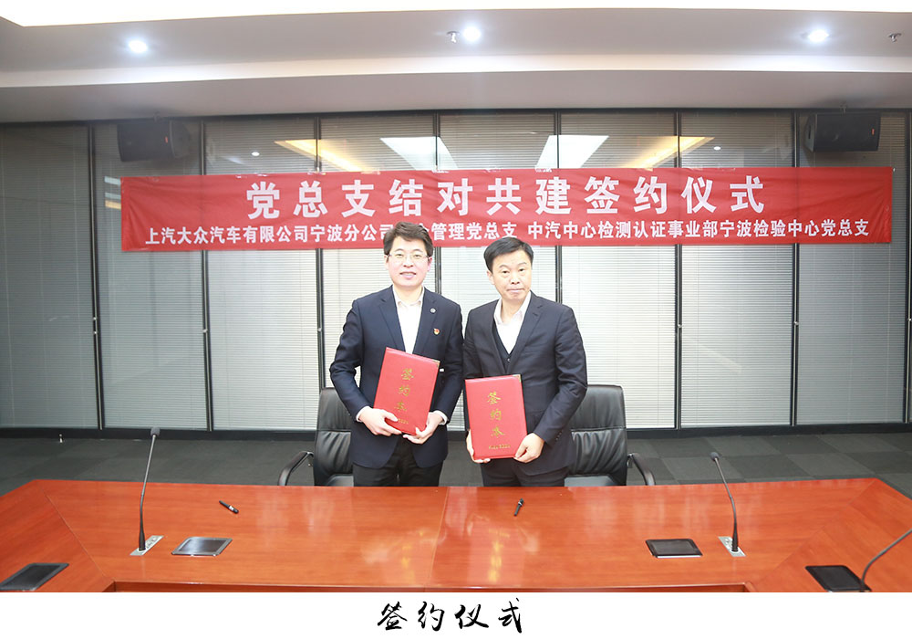 本著“攜手共進、共同發展”的理念,寧波檢驗中心黨總支與上汽大眾寧波分公司綜合管理黨總支簽訂《黨總支結對共建協議書》,就黨建品牌、人才培養、項目合作、資源共享等方面推進雙方長期友好緊密合作,“共筑組織基礎”、“共辦實事好事”、“共促隊伍建設”、“共謀雙方發展”。
