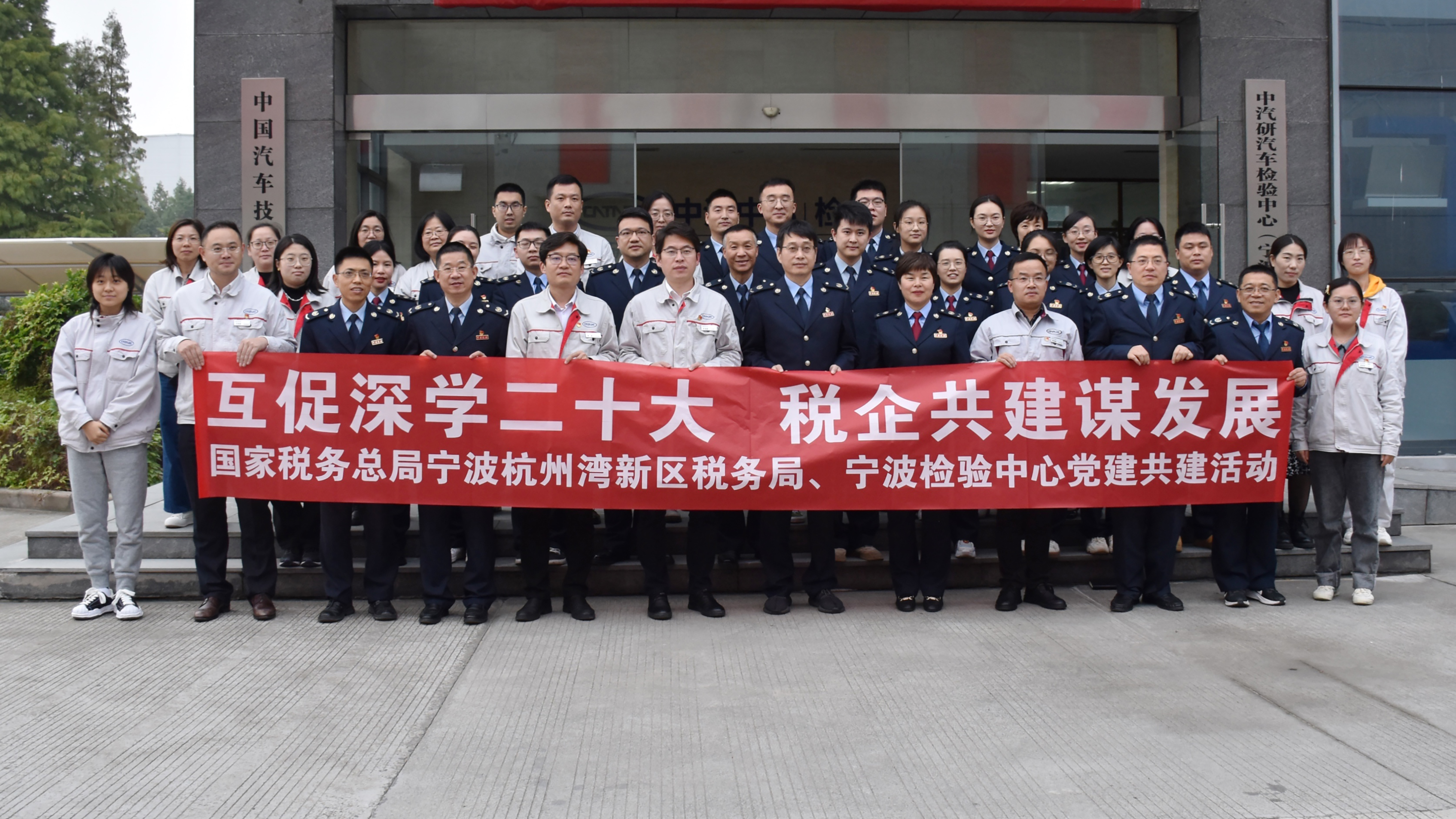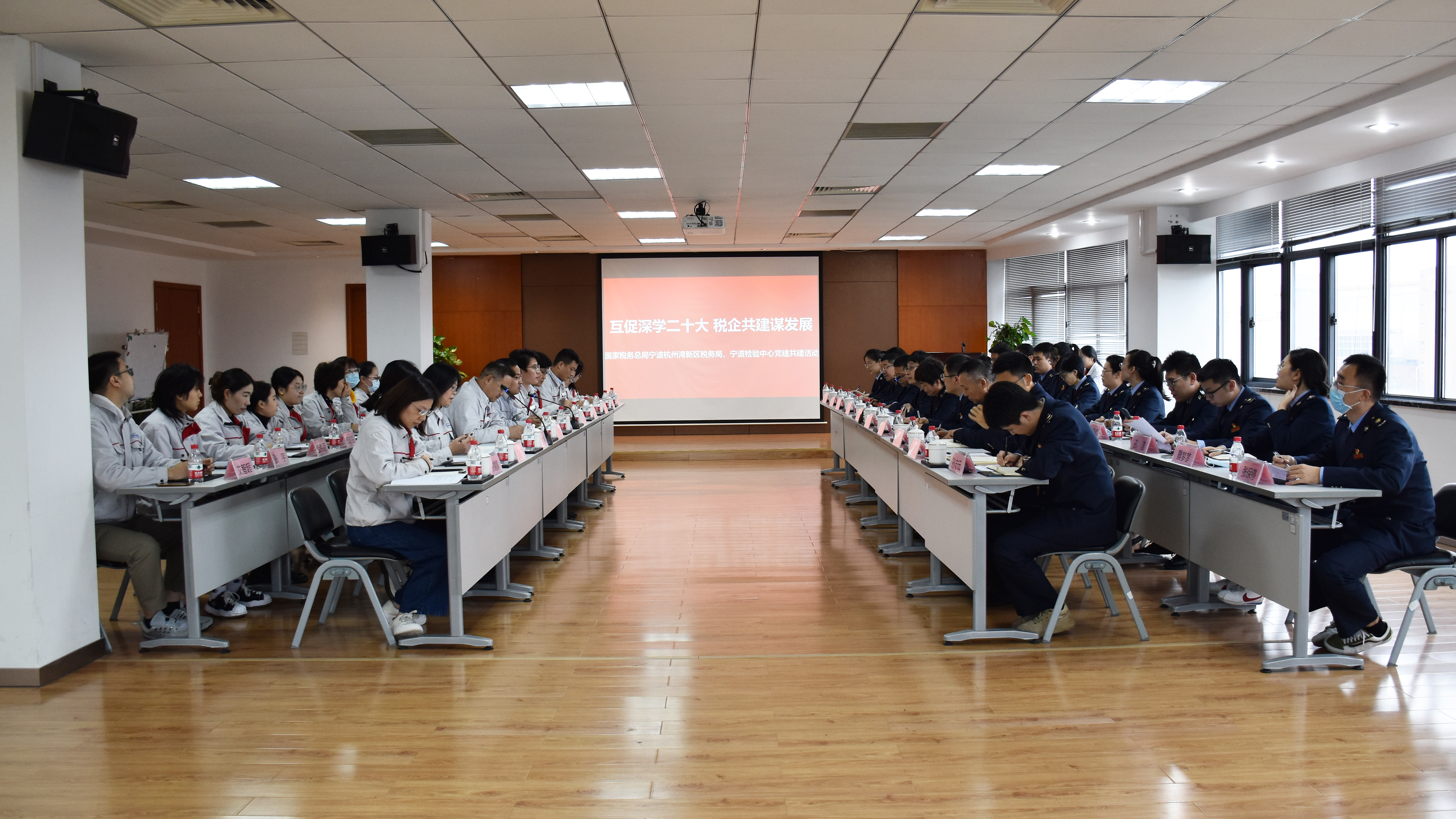 為貫徹落實黨的二十大精神,有力推動黨建與業務深度融合,11月15日,國家稅務總局寧波杭州灣新區稅務局黨委書記、局長楊斌,黨委委員、副局長、機關黨委書記龔建沖帶領稅務局第三、第四黨支部黨員代表一行赴寧波檢驗中心開展“互促深學二十大 稅企共建謀發展”聯學共建活動。寧波檢驗中心黨總支書記、總經理李海斌,寧波檢驗中心黨總支委員、副總經理郭勇,寧波檢驗中心黨員領導干部及代表參加活動。活動由寧波檢驗中心黨總支委員、副總經理朱曉勇主持。