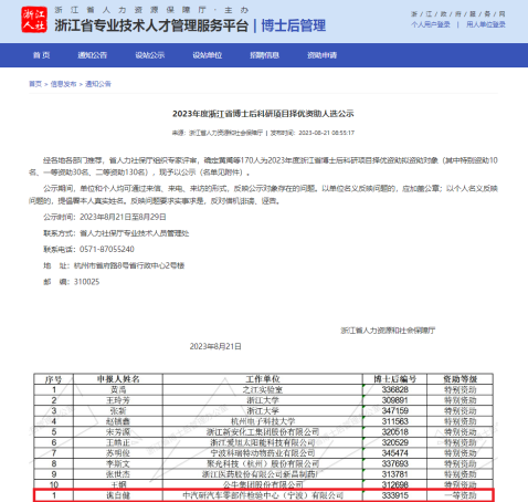 浙江省人力資源和社會保障廳公布了2023年度浙江省博士后科研項目擇優資助人選名單,寧波檢驗中心下屬的中汽研汽車零部件檢驗中心(寧波)有限公司(簡稱寧波零部件公司)1名博士后榮獲科研項目擇優資助一等資助。