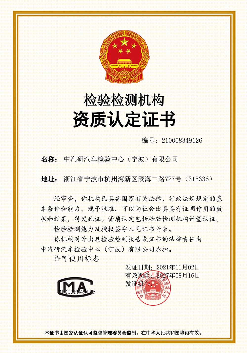 2021年11月2日,經(jīng)國家認(rèn)證認(rèn)可監(jiān)督管理委員會批準(zhǔn),寧波檢驗中心成功獲得國家級檢驗檢測機構(gòu)資質(zhì)認(rèn)定。此次認(rèn)定批準(zhǔn)的檢驗檢測能力涵蓋汽車整車、電動汽車、混合動力電動汽車、客車、專用車、發(fā)動機總成及輔助系統(tǒng)附件、電動汽車動力系統(tǒng)、車身及附件等14類產(chǎn)品,共計416項檢測項目。