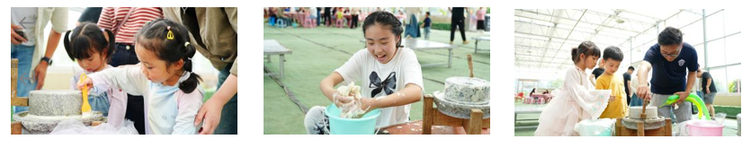 接下來,大家分別體驗了敲拓然、石磨豆漿、繪制風箏等活動。